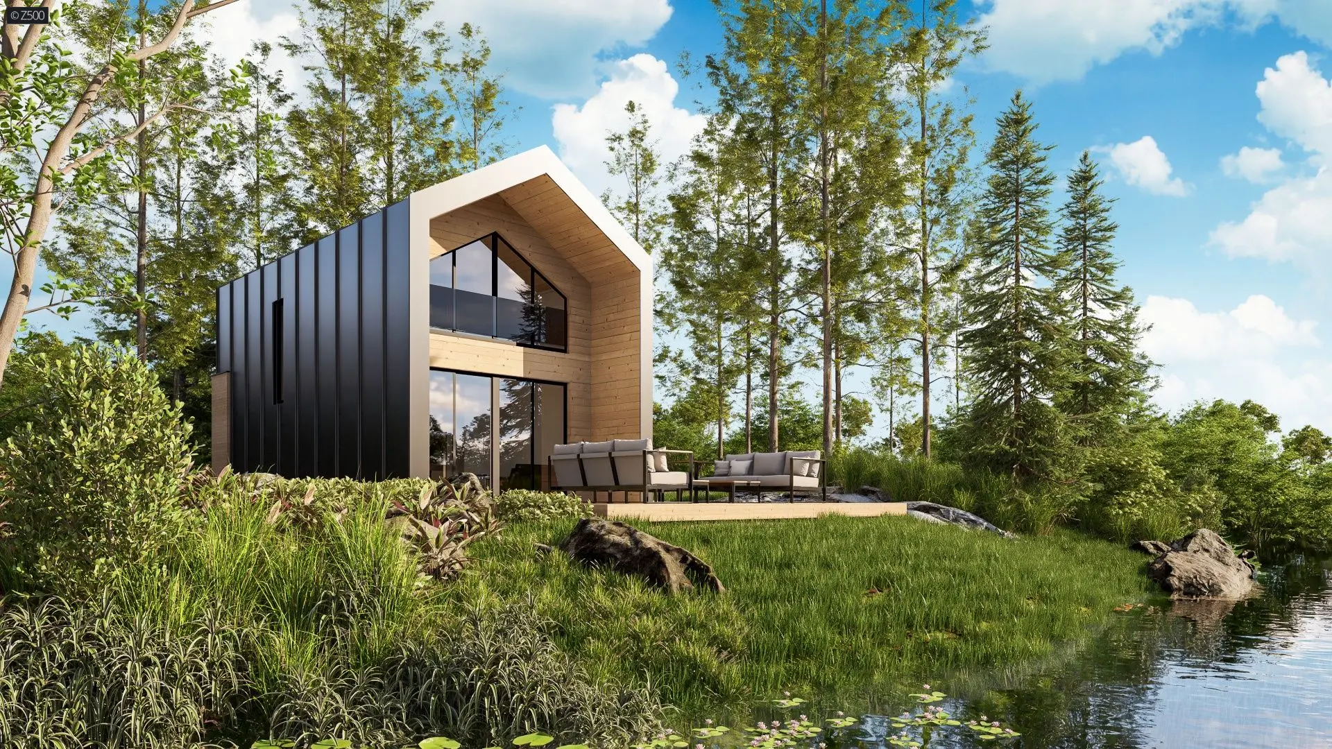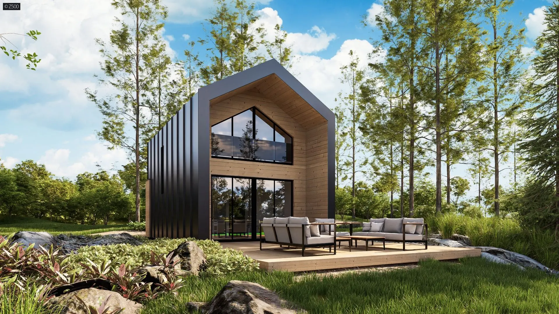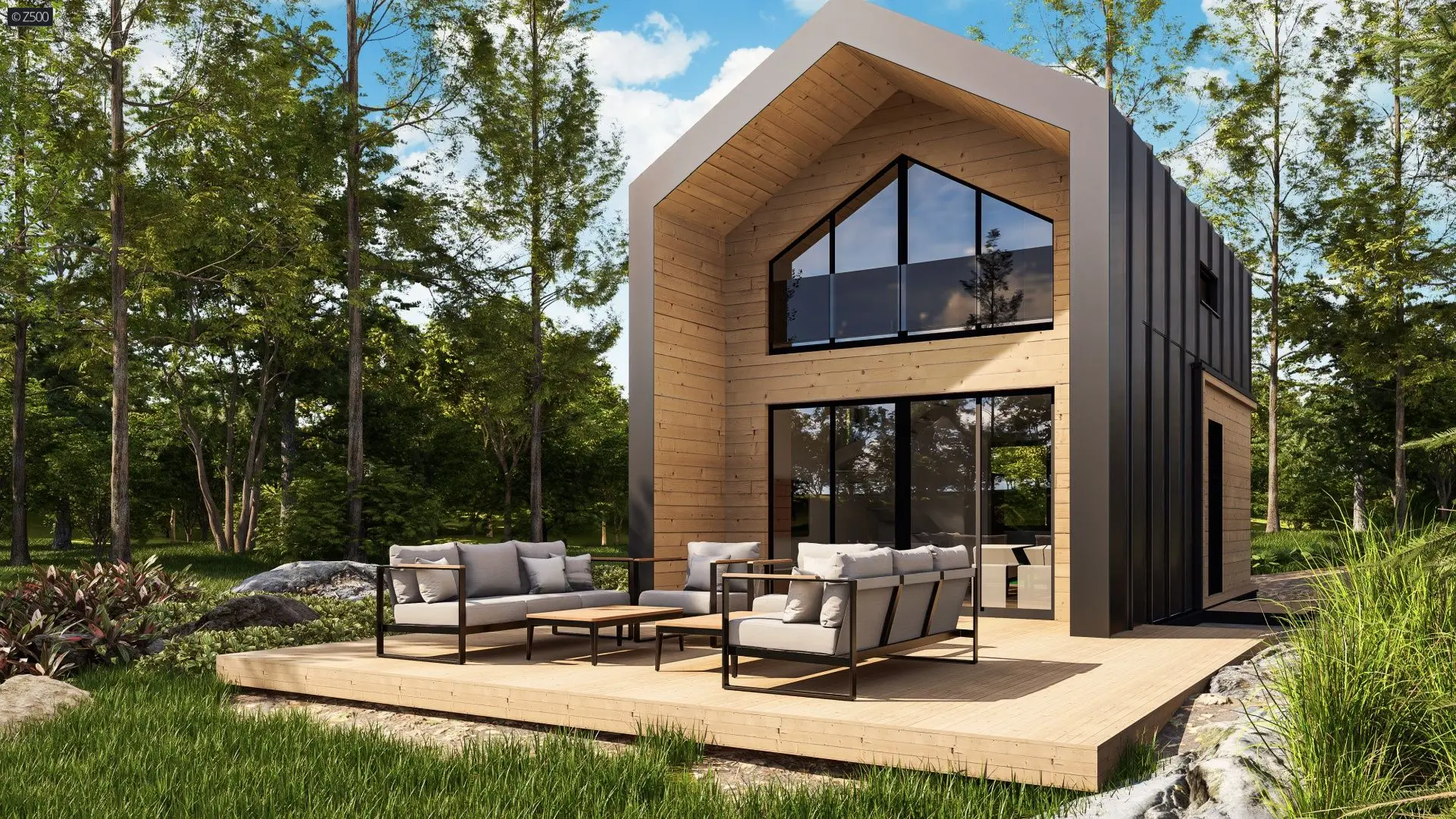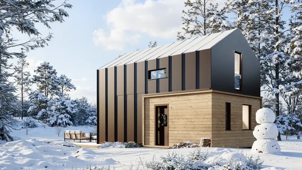 Z523 D to piękny i przestronny domek w stylu nowoczesnej stodoły. Dzięki dużej przeszklonej ścianie szczytowej i otwartej formie wnętrza parter i poddasze zostają przepełnione dziennym światłem. Wnętrze zostało wykorzystane do maksimum, nie ma tu zbędnych kątów czy przestrzeni, każdy centymetr kwadratowy został funkcjonalnie zoptymalizowany. Projektanci zaplanowali dużą strefę dzienną z pół otwartą kuchnią, łazienką oraz dwie sypialnie i łazienkę na górze. Słoneczny i duży salon powiększy się dodatkowo o taras, który dzięki dużym oknom łączy się z wnętrzem przedłużając strefę wypoczynku. Źródłem ciepła w budynku jest pompa ciepła powietrze-powietrze (klimatyzator z funkcją grzania).